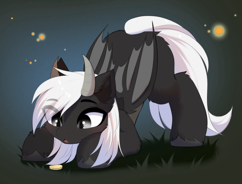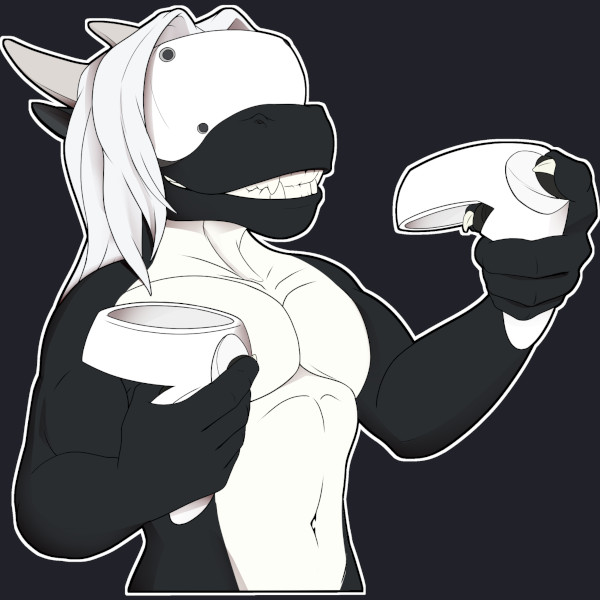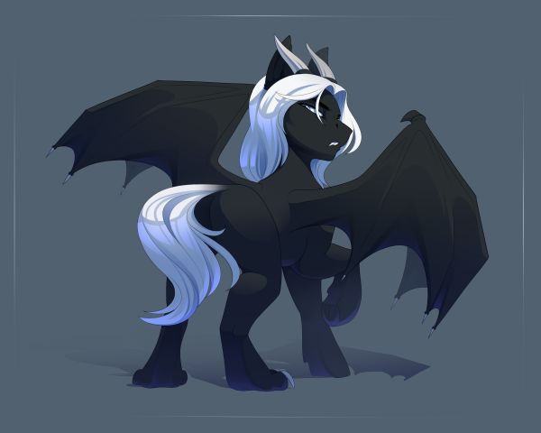The base of his tail is robust, with its length harmoniously mirroring the length stretching from his shoulders to his feet—an extension of his steady and deliberate character. Poised atop his head are two horns, modest in size but striking in their upward curve and backward orientation, conveying a hint of his noble yet understated essence.